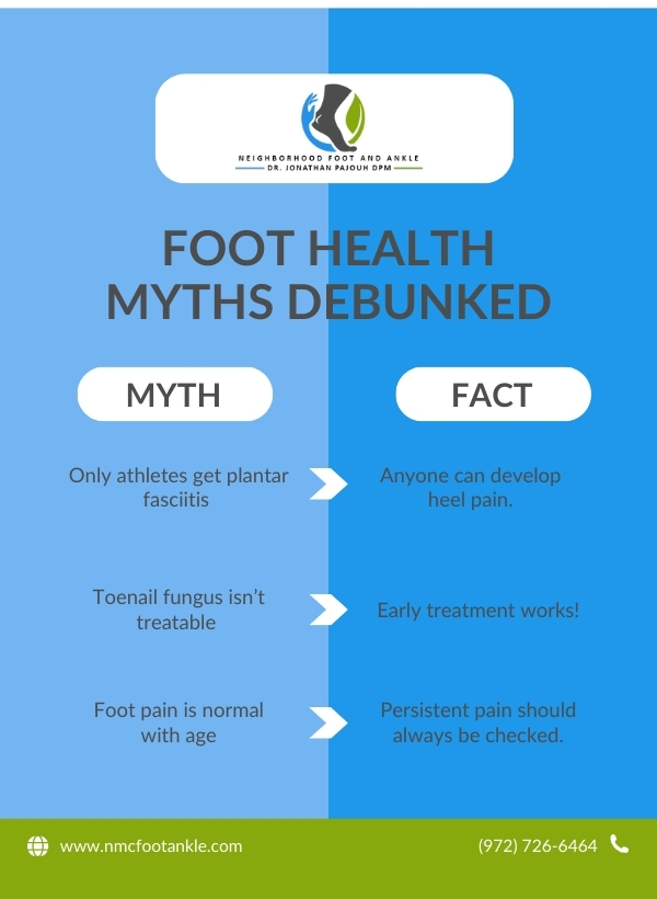 At NMC Foot & Ankle, Dr. Jonathan Pajouh provides expert care to patients in Dallas, helping them address concerns early and avoid complications. Here are some of the most common misconceptions about foot health—and the facts you should know.