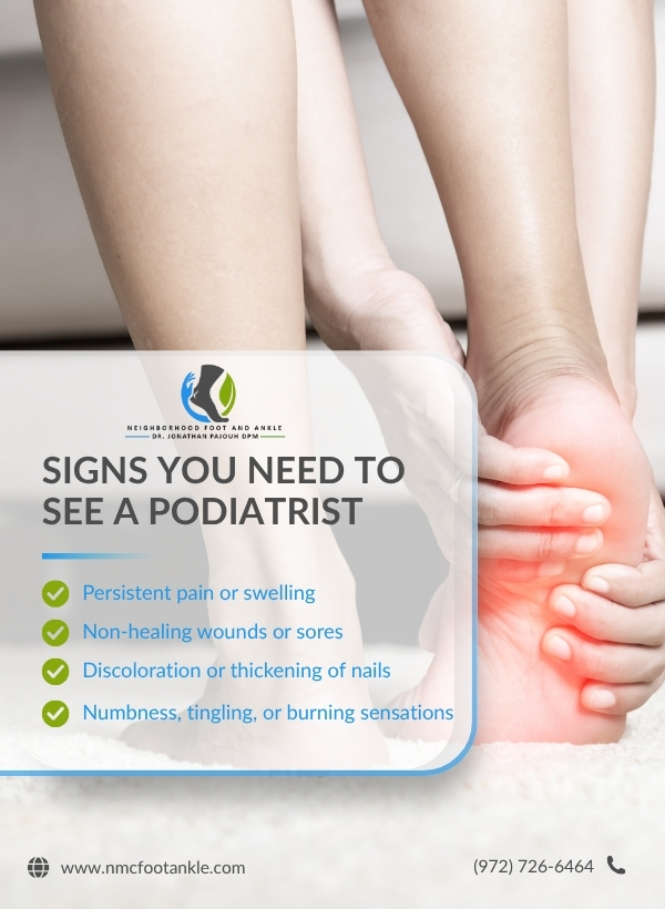 If you’ve noticed any of the above symptoms or have concerns about your feet, it’s important to act now. Don’t wait until the problem worsens. Early evaluation by a qualified podiatrist can help prevent complications and ensure you stay on your feet and moving comfortably. Remember, your feet are the foundation of your mobility, and taking proactive care can keep you on track for an active, healthy lifestyle. Contact the office Dr. Jonathan Pajouh at NMC Foot & Ankle today at (972) 726-6464 or online to ensure the long-term health and well-being of your feet. We’re here to help you live pain-free and maintain your active lifestyle. Don’t let foot problems hold you back—take action now and get the care you deserve.