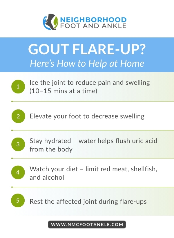 Foot specialists, like those at NMC Foot & Ankle, may evaluate factors such as diet, medical history, and patterns of flare-ups. Addressing these factors can help reduce the frequency and severity of gout attacks over time.