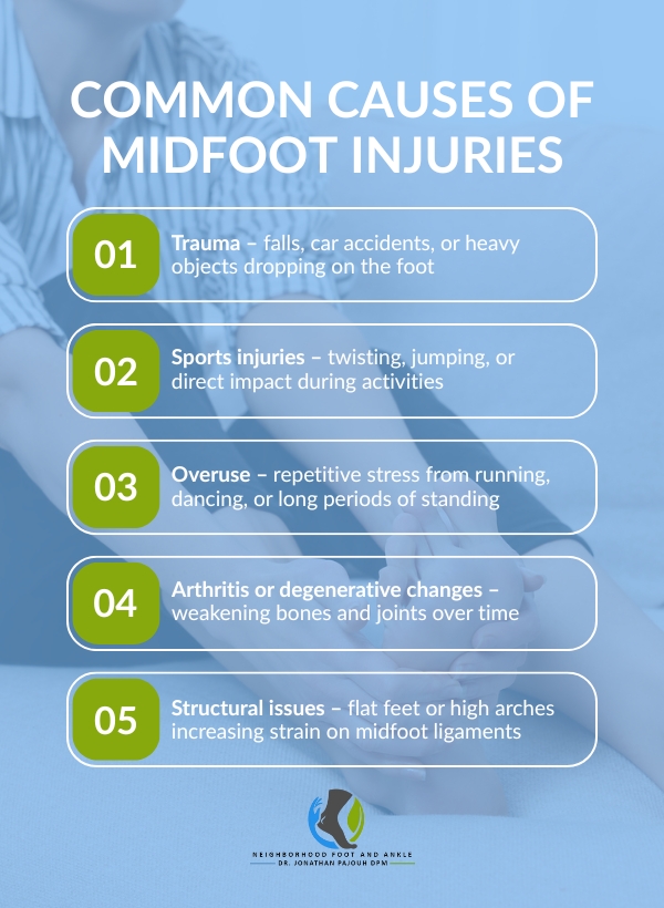 Trauma is one of the most common causes of midfoot injuries. A fall, car accident, or heavy object landing on the foot can result in fractures or ligament tears. Such injuries often lead to immediate pain, swelling, bruising, and difficulty bearing weight.