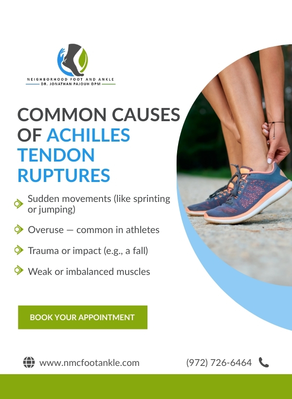 At NMC Foot & Ankle in Dallas, Dr. Jonathan Pajouh, DPM, is an expert in diagnosing and treating Achilles tendon ruptures. With his extensive experience in managing tendon injuries, he can provide a comprehensive treatment plan tailored to your specific needs, whether conservative or surgical, to ensure optimal recovery and long-term mobility.